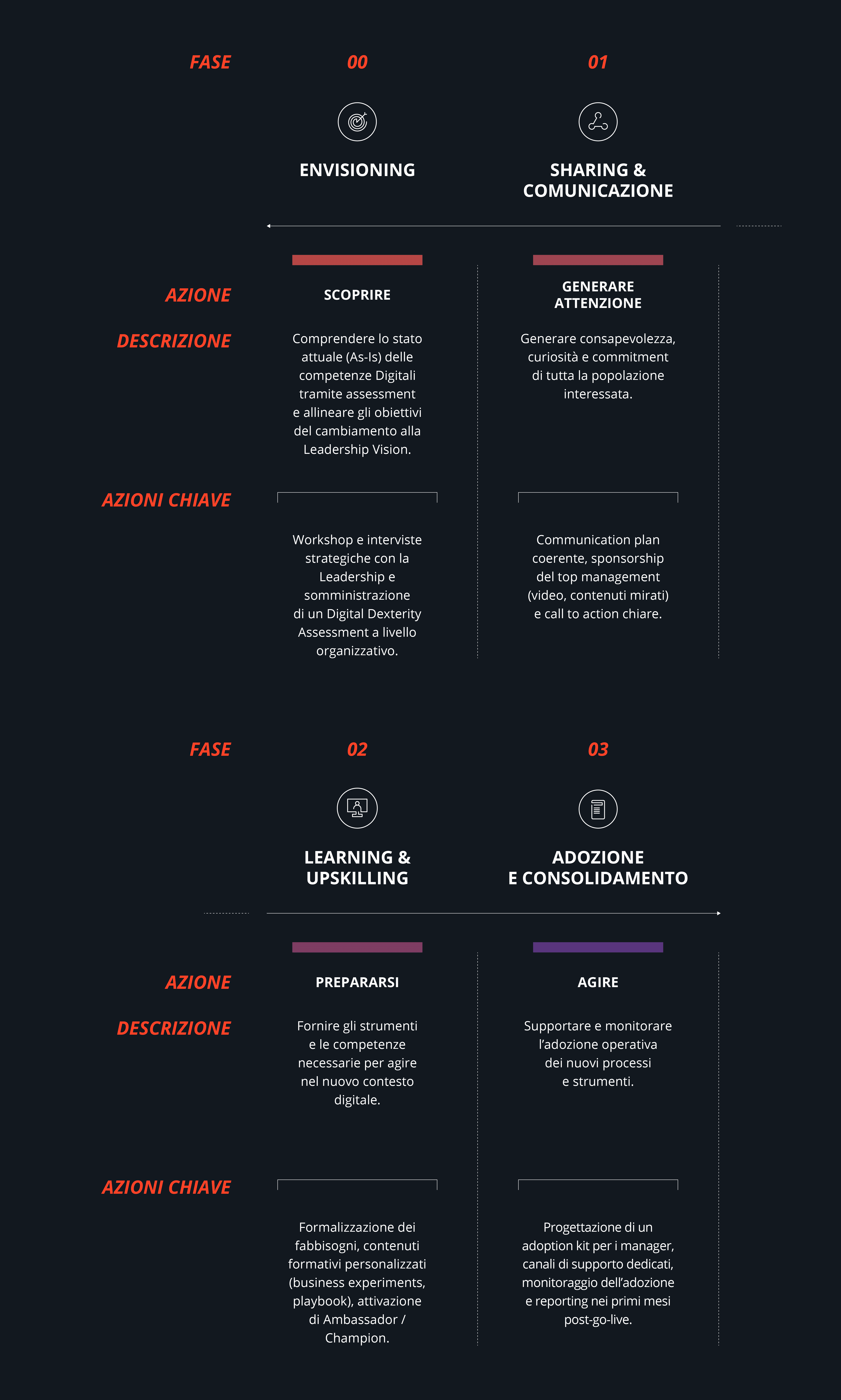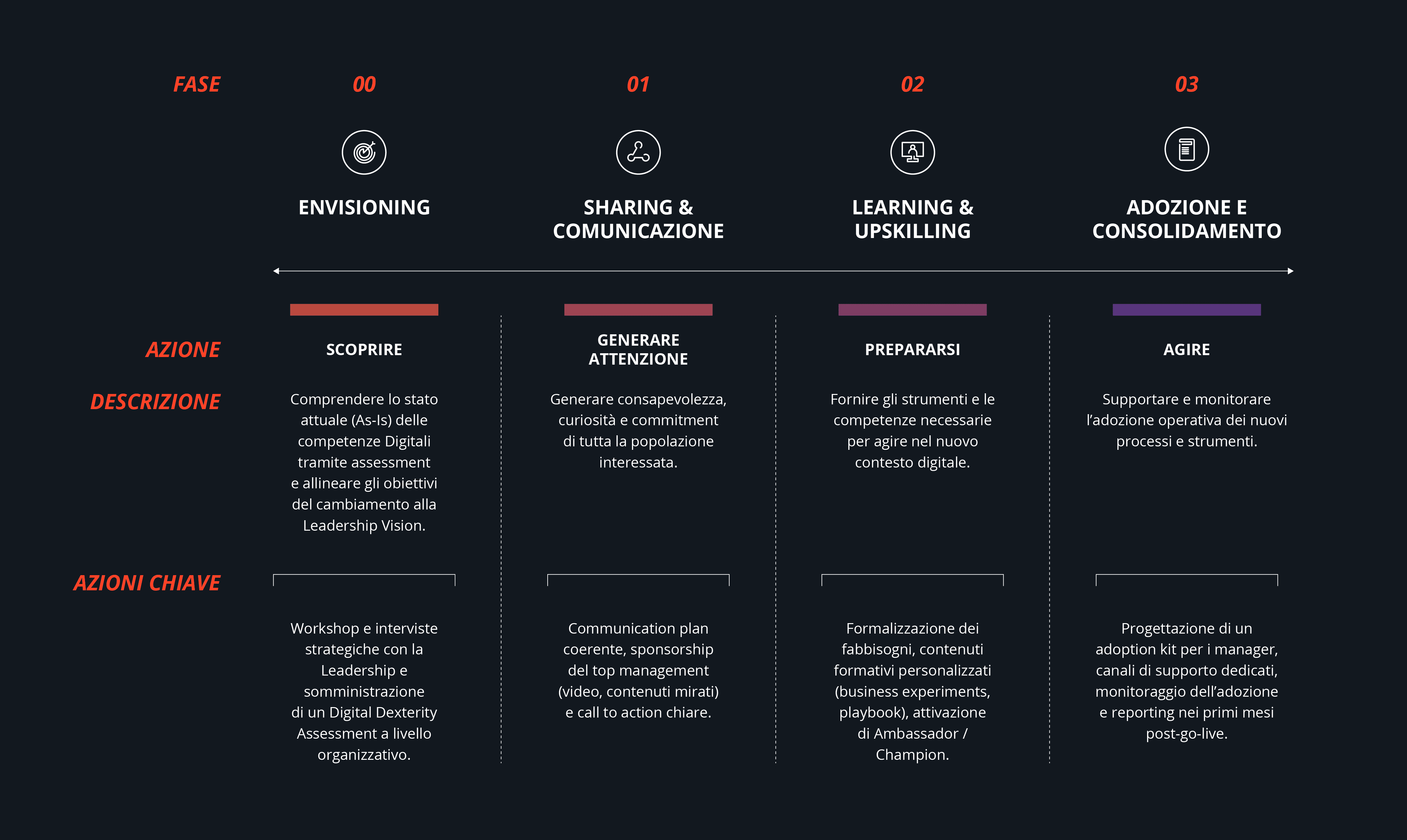 Il percorso che adottiamo per guidare il cambiamento è strutturato in un quadro metodologico in fasi, che garantisce supporto, monitoraggio e allineamento costante.